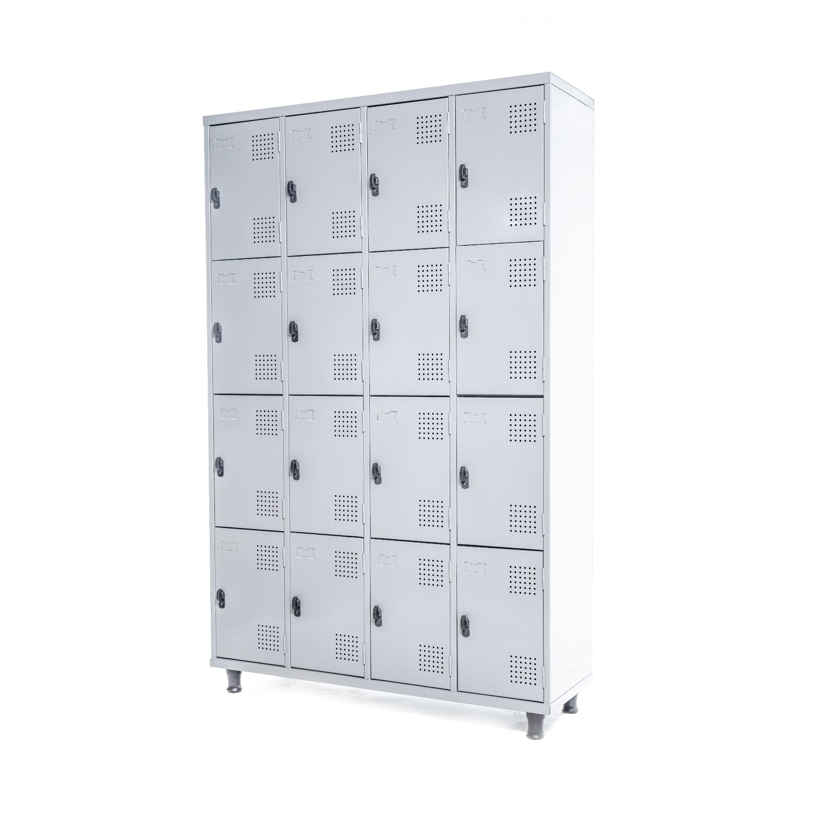 MÓVEL DE AÇO COM ESTAMPA NAS PORTAS, PERMITINDO VENTILAÇÃO. EXCLUSIVA CARENAGEM PROTETIVA, PINTURA TEXTURIZADA ELETROSTÁTICA A PÓ POSSUI 16 PORTAS PITÃO PARA CADEADO MEDIDAS: LARGURA: 1,22M PROFUNDIDADE: 0,40M ALTURA: 1,95M MARCA: SA Gôndolas