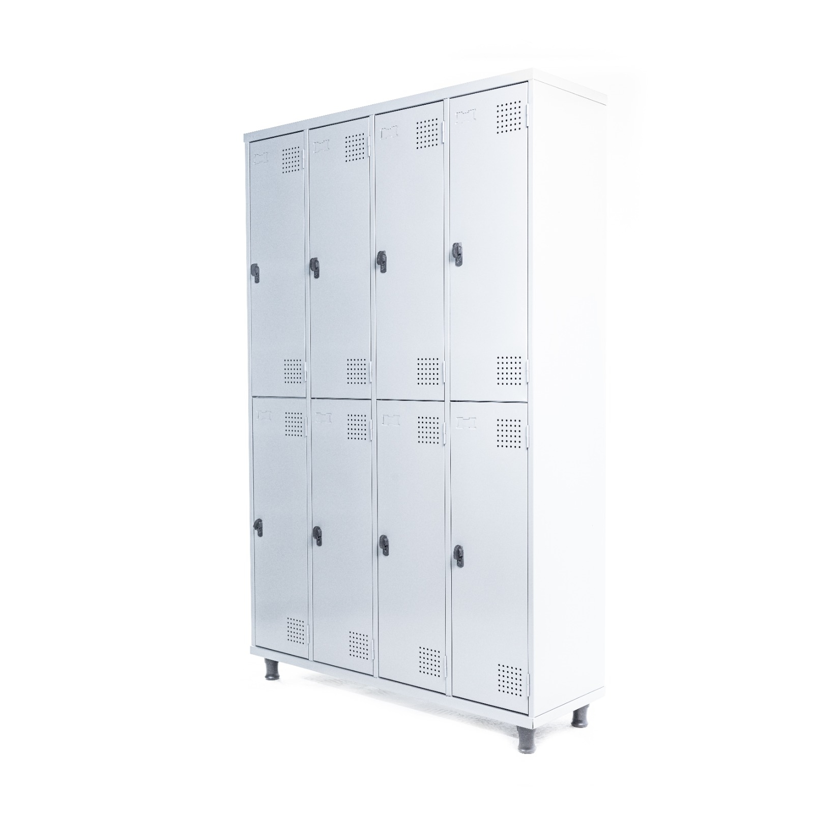 MÓVEL DE AÇO COM ESTAMPA NAS PORTAS, PERMITINDO VENTILAÇÃO. EXCLUSIVA CARENAGEM PROTETIVA, PINTURA TEXTURIZADA ELETROSTÁTICA A PÓ POSSUI 8 PORTAS GRANDES PITÃO PARA CADEADO MEDIDAS: LARGURA: 1,22M PROFUNDIDADE: 0,4M ALTURA: 1,95M MARCA: SA Gôndolas